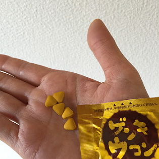 「他とは違うんだぜ~」というその凄さが今ひとつ伝わらなかったのですが、個別包装の1包の中に5粒の黄色い三角の物体。